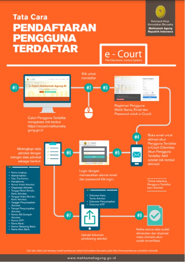 Dalam hal pendaftaran perkara Online, saat ini dikhususkan untuk Advokat. Pengguna terdaftar harus setelah mendaftar dan mendapatkan Akun, harus melalui mekanisme validasi Advokat oleh Pengadilan Tinggi tempat dimana Advokat disumpah, sedangkan pendaftaran dari Perseorangan atau Badan Hukum akan diatur lebih lanjut. |