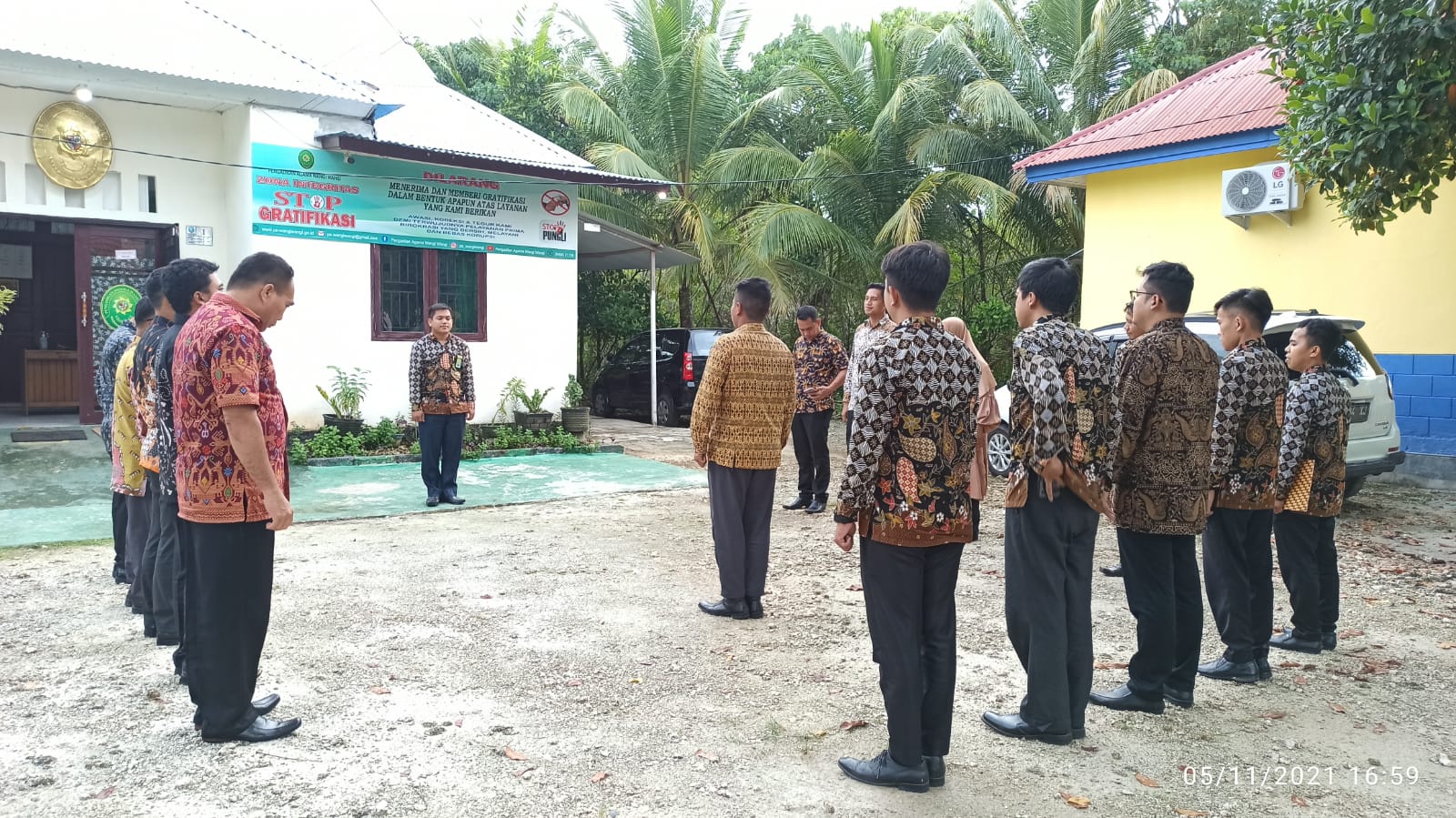 Wangi Wangi - Jumat, 05 November 2021. Pengadilan Agama Wangi Wangi melaksanakan Apel Sore yang dipimpin langsung Oleh Sekretaris Pengadilan Agama Wangi Wangi, Bpk. Riswan Sofyan, S.HI., Dalam kesempatan ini beliau menyampaikan amanatnya untuk lebih memperhatikan tugas dan tanggung jawab masing masing pegawai dan juga agar segera menyelesaikan perbaikan hasil telusur dokumen APM Tahun 2021 di minggu kedua Bulan November ini.