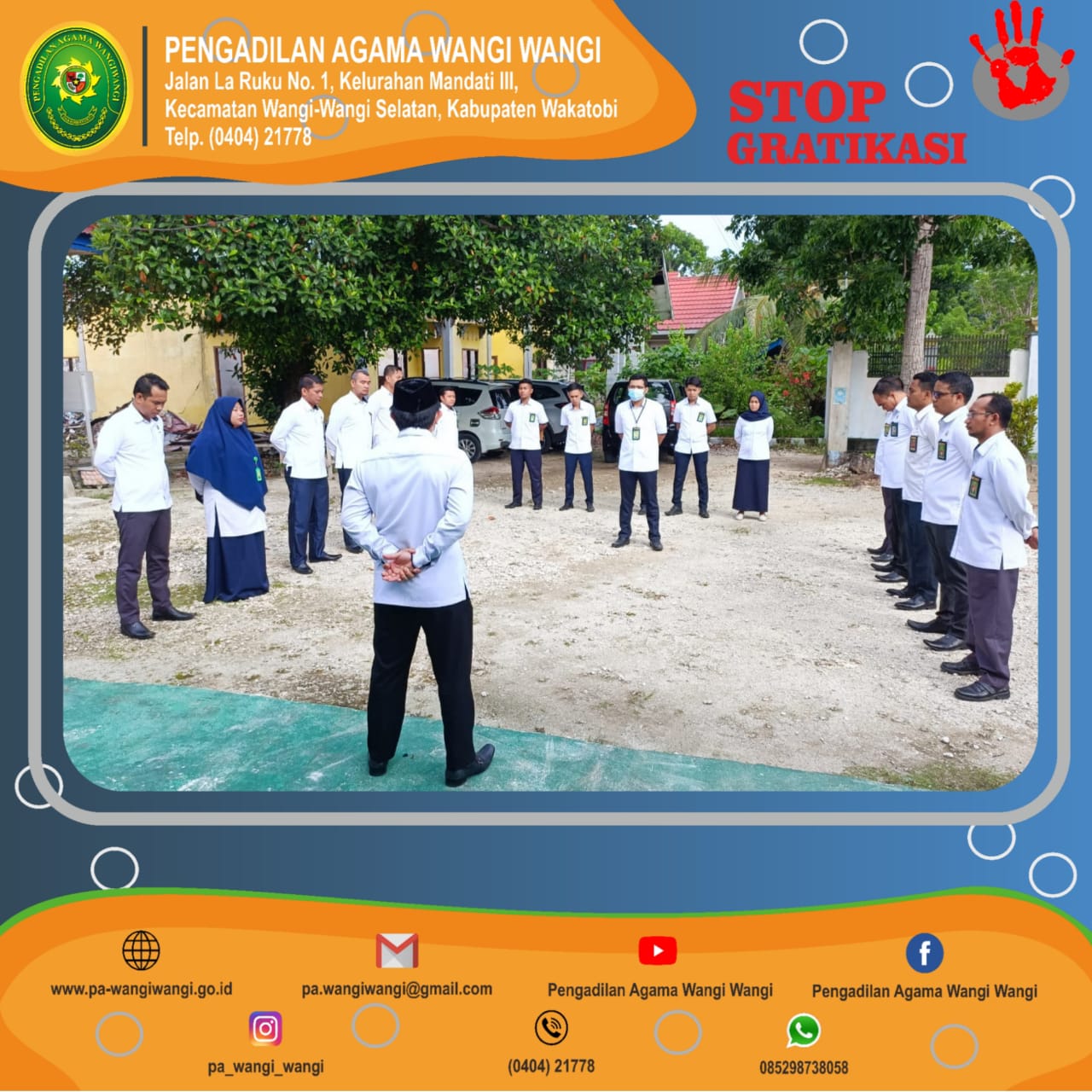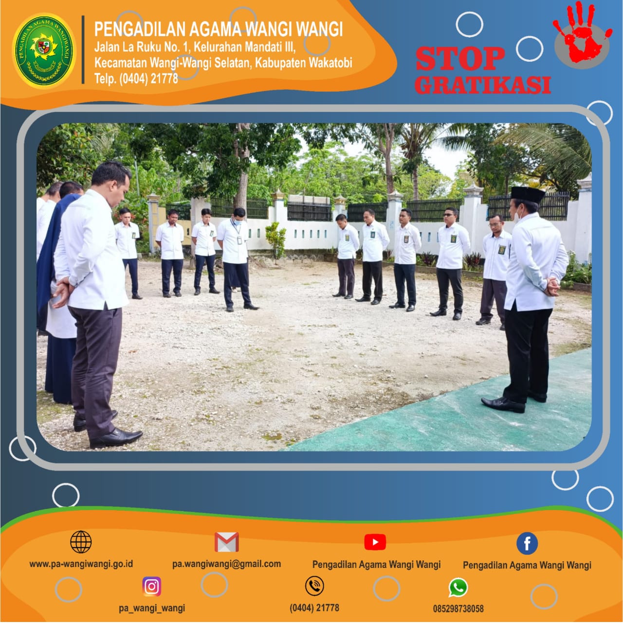 Wangi Wangi - Senin, 13 Desember 2021. Pengadilan Agama Wangi Wangi melaksanakan Apel Pagi yang dipimpin langsung Oleh Ketua Pengadilan Agama Wangi Wangi, Bpk. Andi Muhammad Yusri Patawari, S.H.I., M.H., Dalam kesempatan ini beliau menyampaikan agar tetap menjaga kebersihan kantor dan mempersiapkan kedatangan Ketua Pengadilan Tinggi Agama Sulawesi Tenggara beserta rombongan.