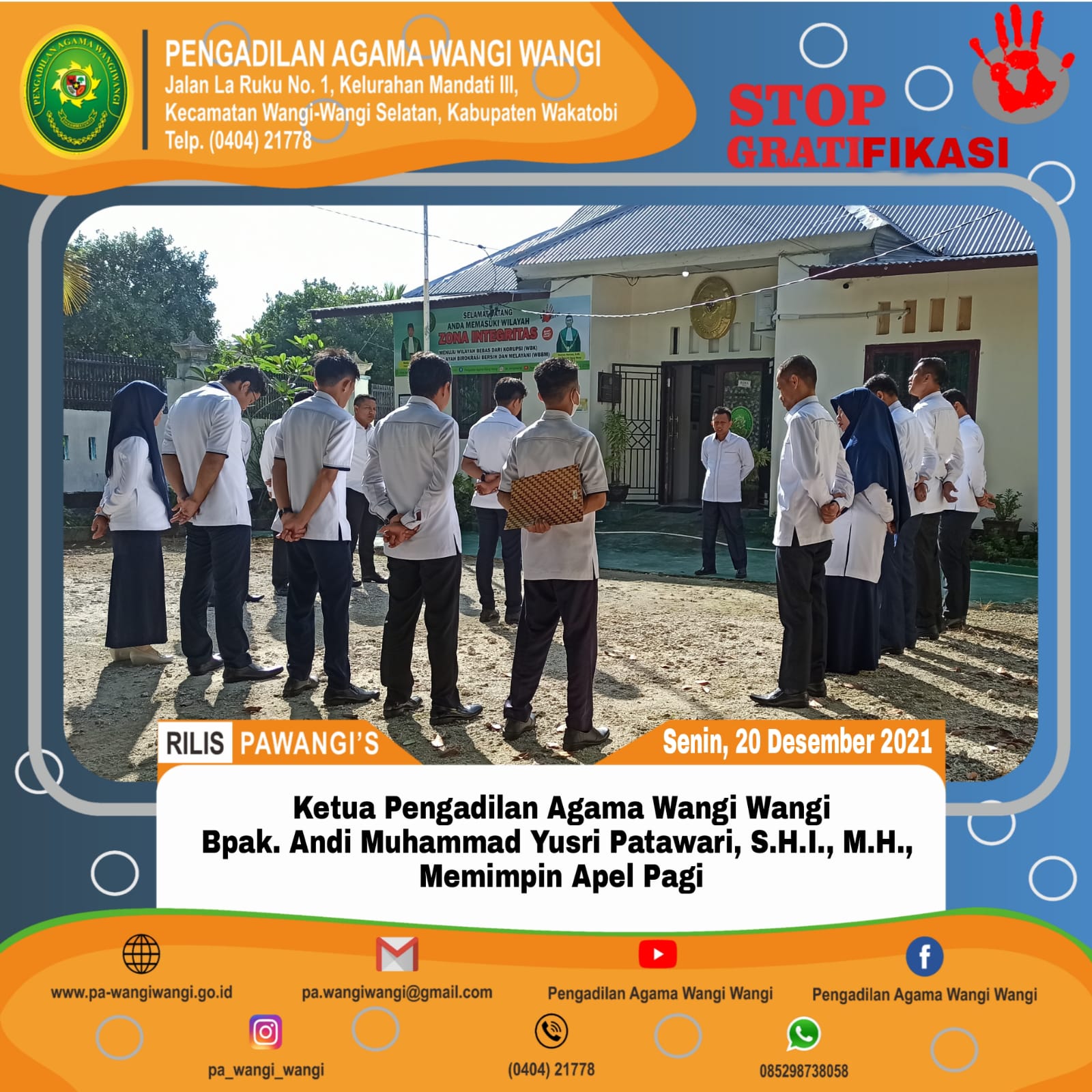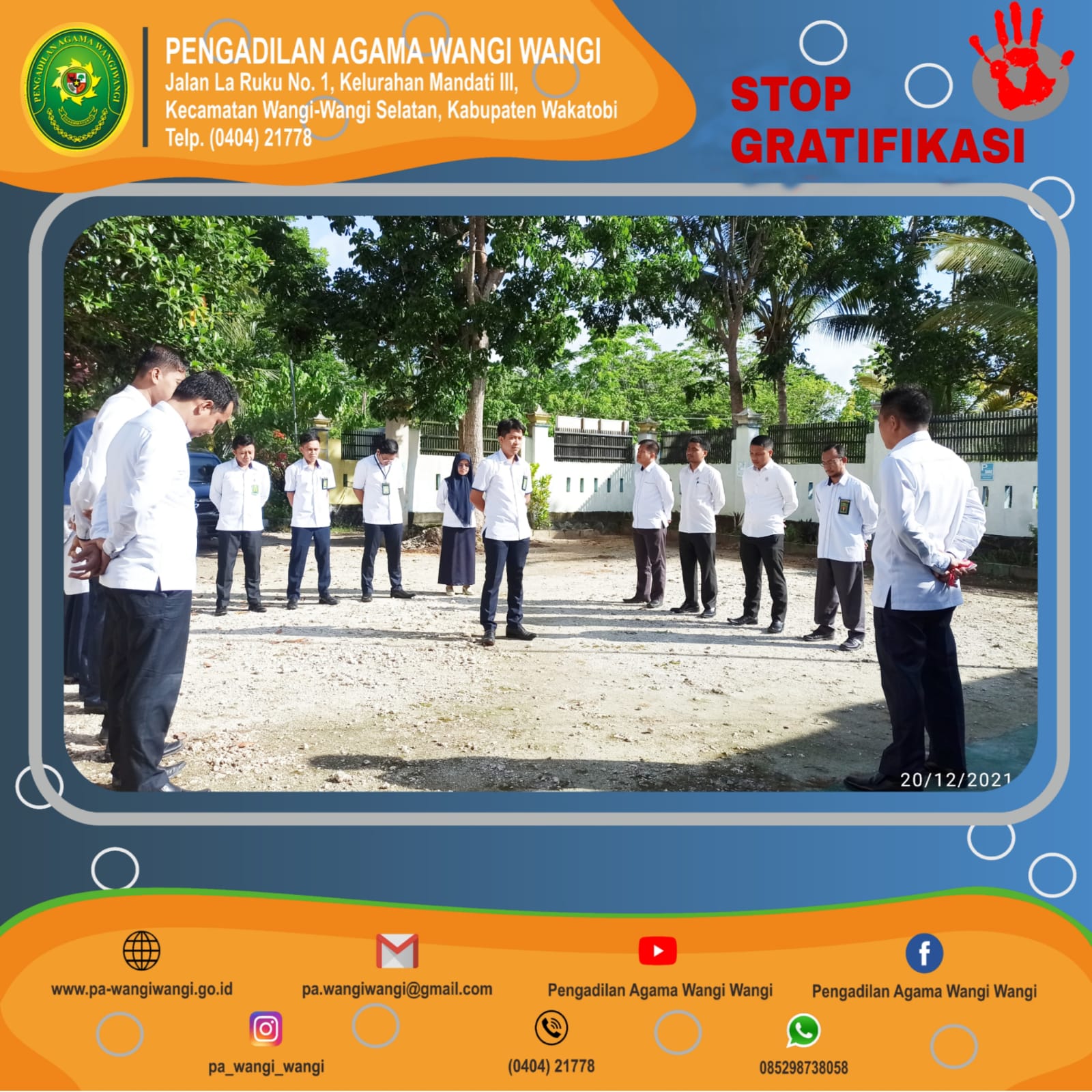 Wangi Wangi - Senin, 20 Desember 2021. Pengadilan Agama Wangi Wangi melaksanakan Apel Pagi yang dipimpin langsung Oleh Ketua Pengadilan Agama Wangi Wangi, Bpk. Andi Muhammad Yusri Patawari, S.H.I., M.H.,, Dalam kesempatan ini beliau menyampaikan agar segera melakukan tindak lanjut terhadap temuan HATIBINWASDA Sultra, selain itu beliau juga menyampaikan bahwa Laporan Tahunan sudah bisa dibuat, dan selalu menerapkan 5S dan 5R dalam melakukan pelayanan kepada para pencari keadilan khususnya di PTSP.
