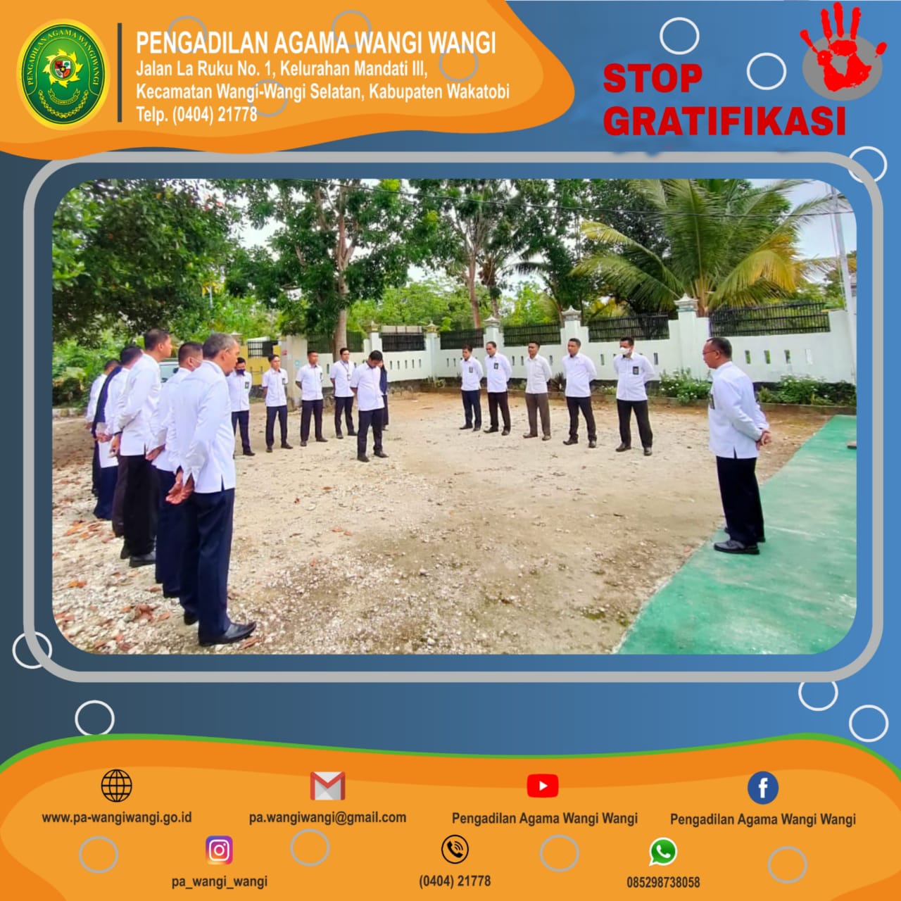 Apel Pagi ini diikuti oleh Ketua, Hakim dan Aparatur pegawai Pengadilan Agama Wangi Wangi yang bertempat di halaman kantor Pengadilan Agama Wangi Wangi. Apel Senin Pagi ini berjalan dengan lancar dengan Komandan Apel Pagi Sdra. La Ode Sofyan, S.IP., (PPNPN) dan Sdra. Yogi Sumardi, S.Kom., memimpin do’a sebelum mengakhiri aktivitas pada pekan ini. IT PA WANGI WANGI