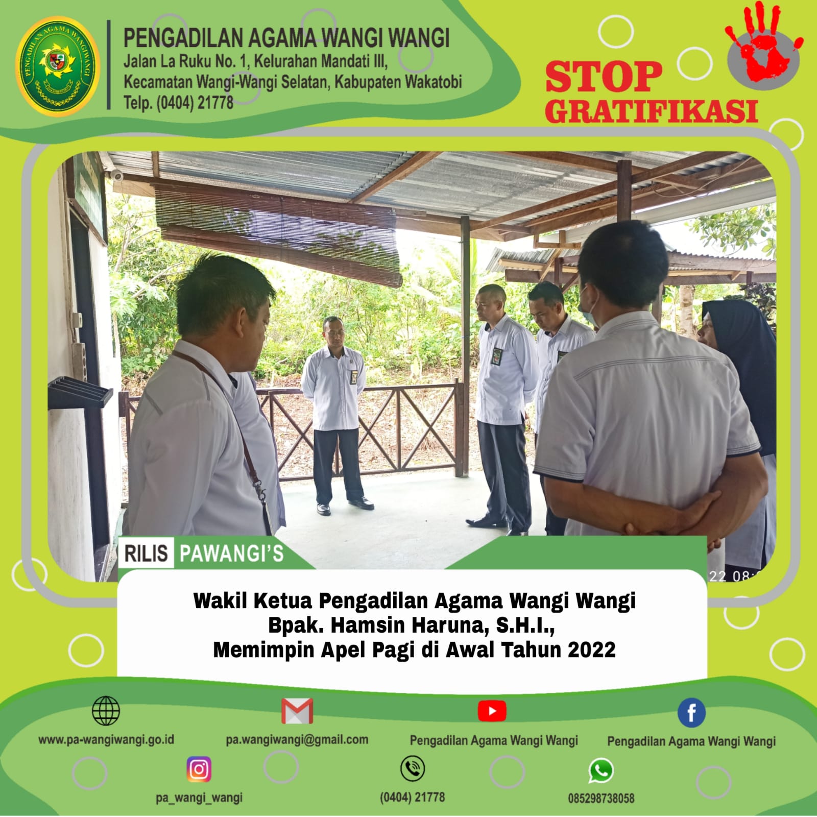 Wangi Wangi - Senin, 03 Januari 2022. Pengadilan Agama Wangi Wangi melaksanakan Apel Pagi awal tahun 2022 yang dipimpin langsung Oleh Wakil Ketua Pengadilan Agama Wangi Wangi, Bpk. Hamsin Haruna, S.H.I., Dalam kesempatan ini beliau menyampaikan terkait kegiatan di awal tahun 2022, dan penataan kembali PTSP dengan hadirnya layanan Posbakum, serta kedisiplinan pegawai di tahun 2022.