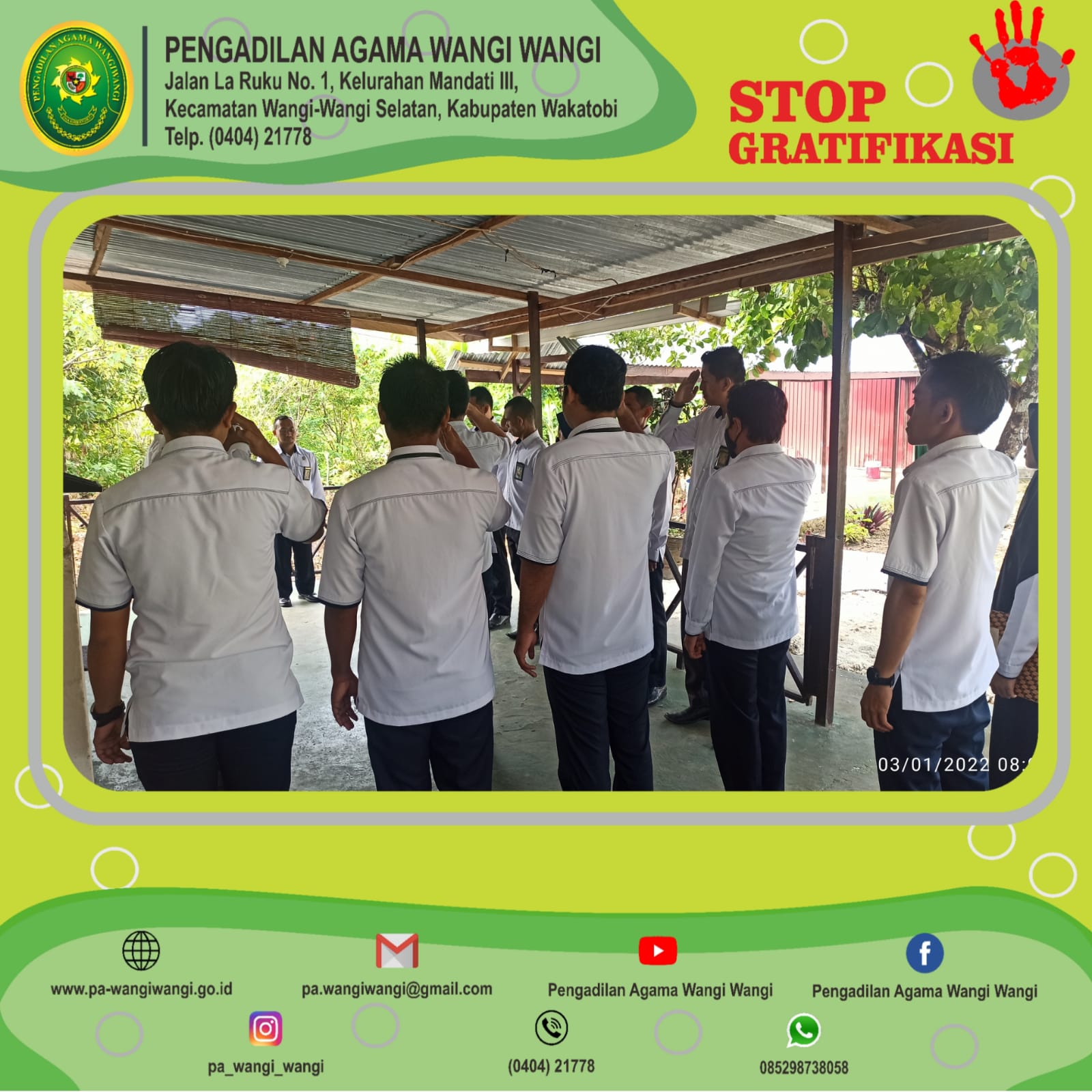 Apel Pagi ini diikuti oleh Ketua, Hakim dan Aparatur pegawai Pengadilan Agama Wangi Wangi yang bertempat di Ruang Tunggu Sidang PA Wangi Wangi karena cuaca yang kurang bersahabat. Apel Senin Pagi ini berjalan dengan lancar dengan Komandan Apel Pagi Sdra. Ikhsan Ariansyah, S.T., (CPNS) dan Ibu Yeti Asmiati, S.H., memimpin do’a sebelum mengakhiri aktivitas pada pekan ini. IT PA WANGI WANGI
