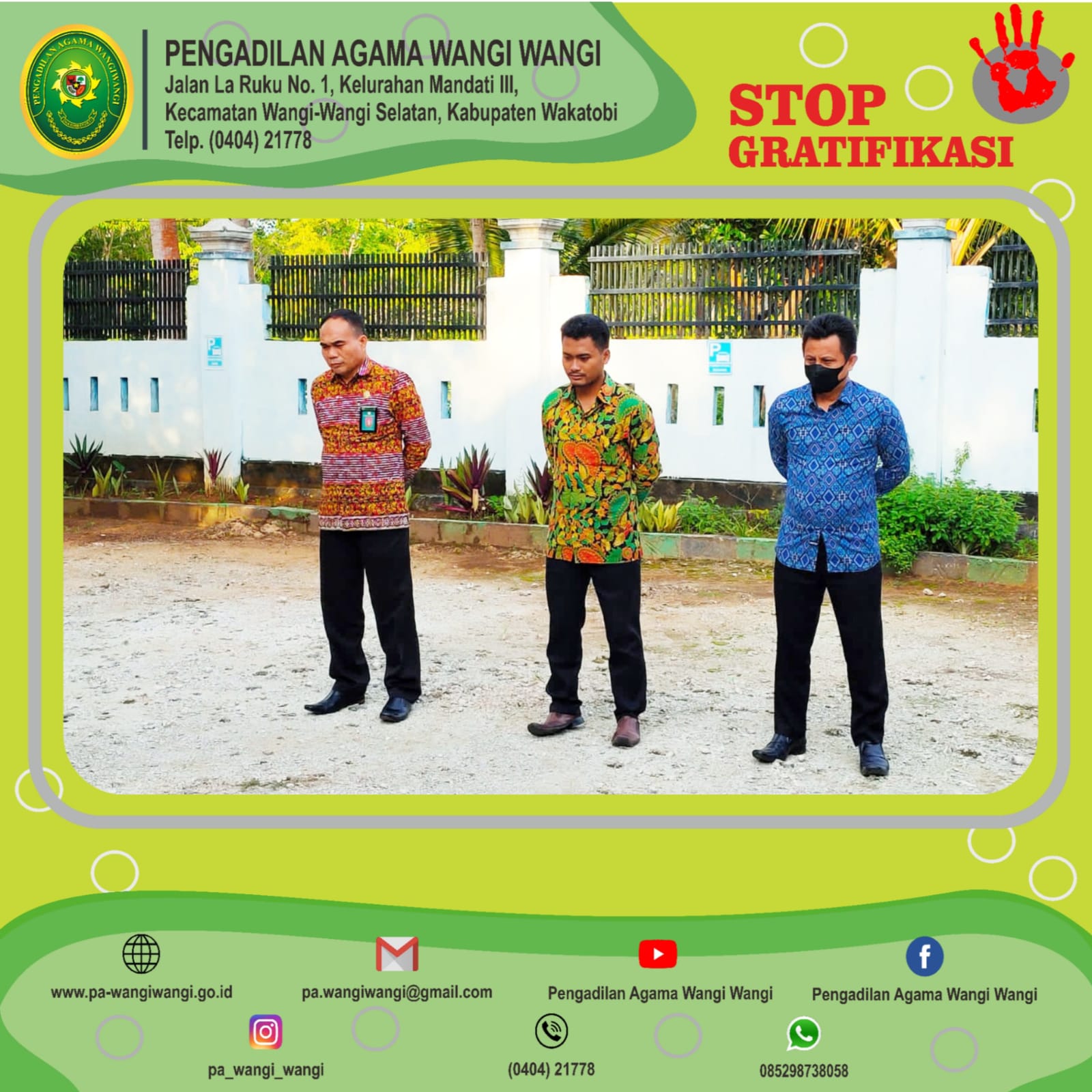 Apel ini diikuti oleh seluruh pegawai Pengadilan Agama Wangi Wangi dan pelaksanaannya bertempat di halaman kantor Pengadilan Agama Wangi Wangi. Apel Jumat Sore ini berjalan dengan lancar dengan Komandan Apel Sore Sdra. Julisman., (PPNPN) dan Bpak. La Ode Sofyan, S.IP., (PPNPN) yang memimpin do’a sebelum mengakhiri aktivitas pada pekan ini. Tim IT PA Wangi Wangi