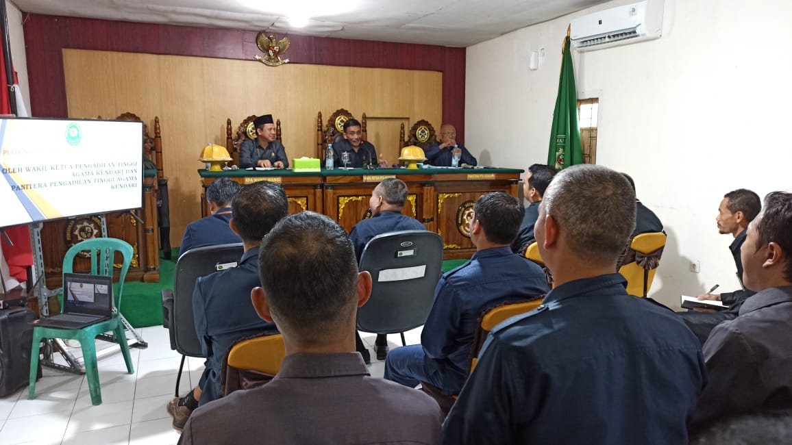 Bertempat di ruang sidang utama Pengadilan Agama Wangi Wangi, YM. Wakil Ketua Pengadilan Tinggi Agama Kendari di dampingi Panitera Pengadilan Tinggi Agama Kendari dan dihadiri oleh seluruh Aparatur pada Pengadilan Agama Wangi Wangi, menyampaikan hasil Pengawasan dan Evaluasi sekaligus Pembinaan, acara yang dibuka oleh Ketua Pengadilan Agama Wangi Wangi sekaligus Moderator. Dalam kegiatan ini YM. Wakil Ketua Pengadilan Tinggi Agama Kendari, menyampaikan beberapa hal diantaranya yakni bahwa Peradilan Agama merupakan tempat kita mengabdi, ini merupakan nikmat yang hal patut kita syukuri dan berbangga, dalam kesempatan ini pula YM. Wakil Ketua Pengadilan Tinggi Agama Kendari berpesan bahwa dalam melaksanakan tugas pokok kita harus bekerja secara team, antara satu bidang dan bidang lain saling berkaitan untuk itu tetap menjaga kebersamaan dan kekompakan. selain itu pula beliau memaparkan hasil pengawasan yang terbagi dalam 2 bagian yakni bagian yang terkait Bidang Non Tehnis dan Bidang Tehnis atau Yustisial.